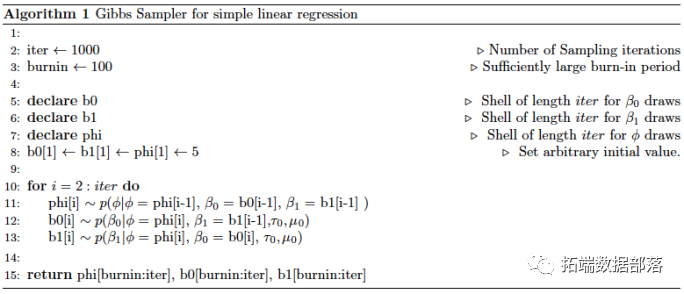 为了从这个后验分布中得出,我们可以使用Gibbs抽样算法。吉布斯采样是一种迭代算法,从每个感兴趣的参数的后验分布产生样本。它通过按照以下方式从每个参数的条件后面依次绘制: