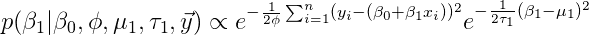p\[i\]<- (-(1/(2\*phi))\*sum( (y - (grid\[i\]+b1\*x))^2 )) + ( -(1/(2\*t0))*(grid\[i\] - m0)^2)