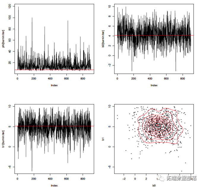 结果很好。下图显示了1000个吉布斯(Gibbs)样品的序列。红线表示我们模拟数据的真实参数值。第四幅图显示了截距和斜率项的后面联合,红线表示轮廓。