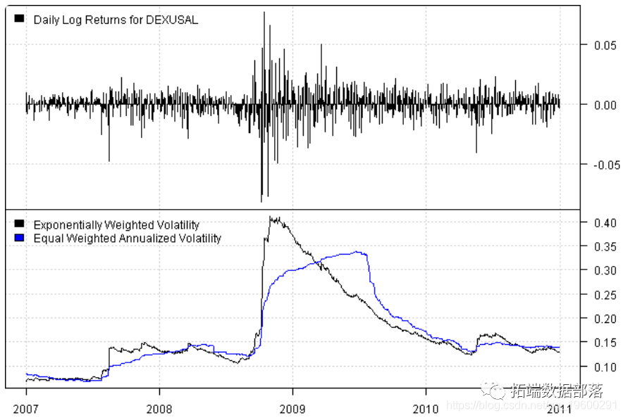 不出所料,指数加权波动率在最近的观察结果中占了更大的比重,是一种更具反应性的风险度量。