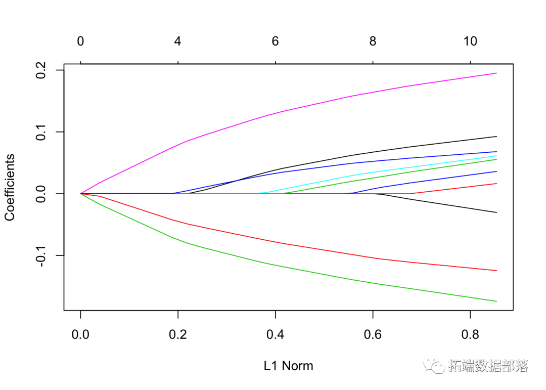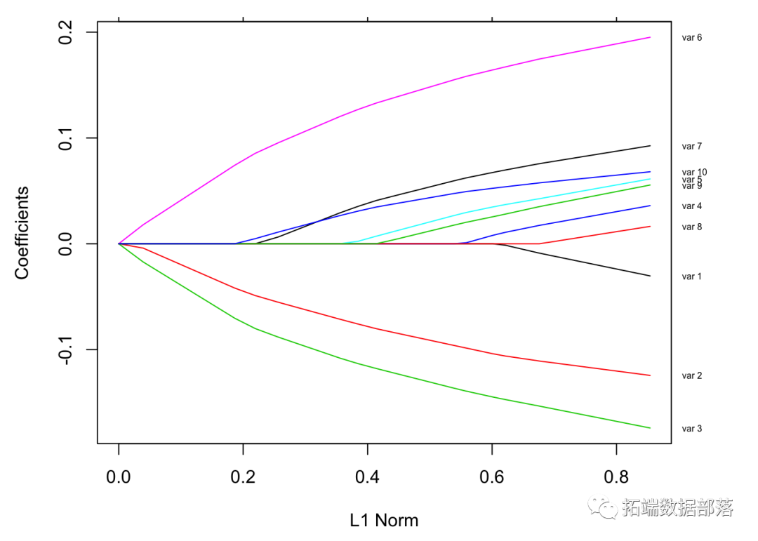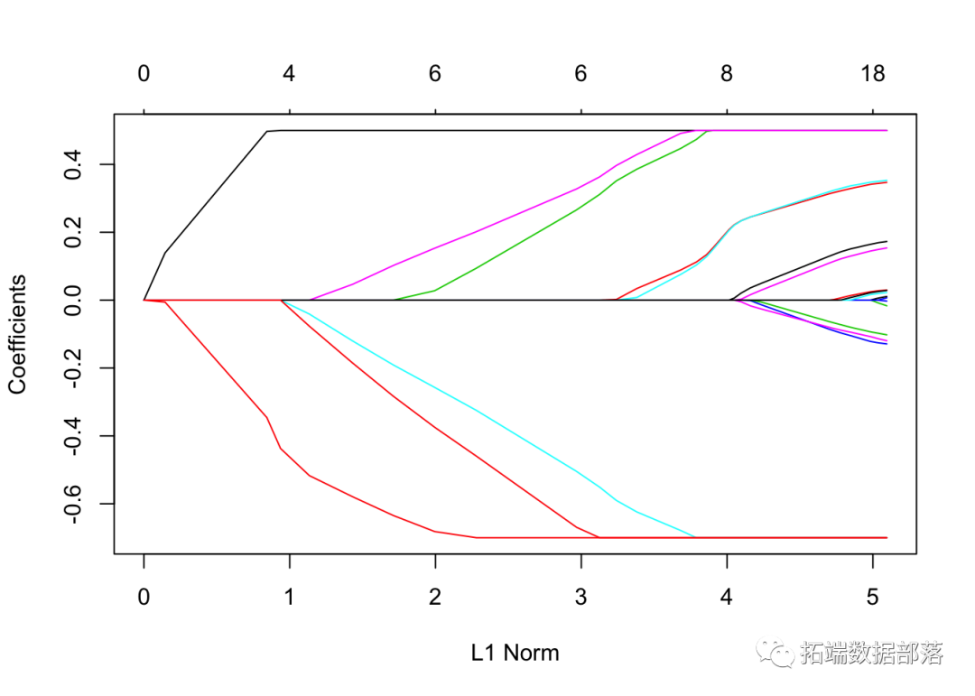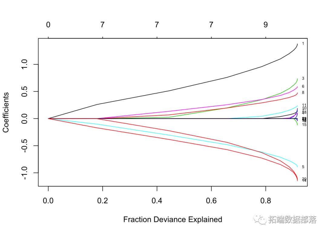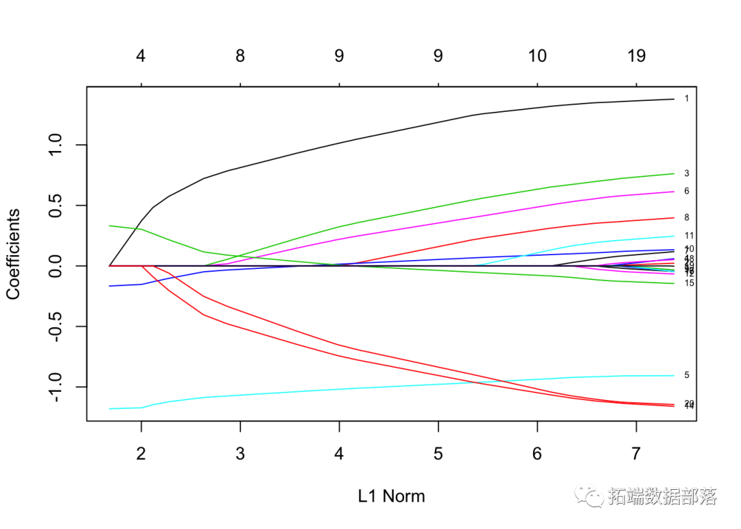 每条曲线对应一个变量。它显示了当λ变化时,其系数相对于整个系数向量的ℓ1范数的路径。上方的轴表示当前λ处非零系数的数量,这是套索的有效自由度(_df_)。用户可能还希望对曲线进行注释。这可以通过label = TRUE