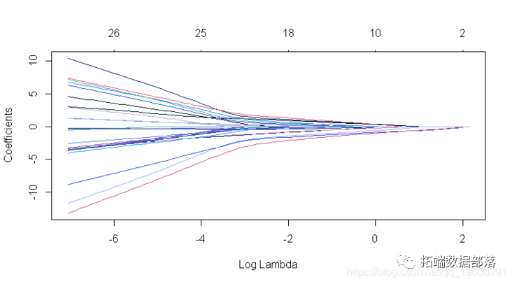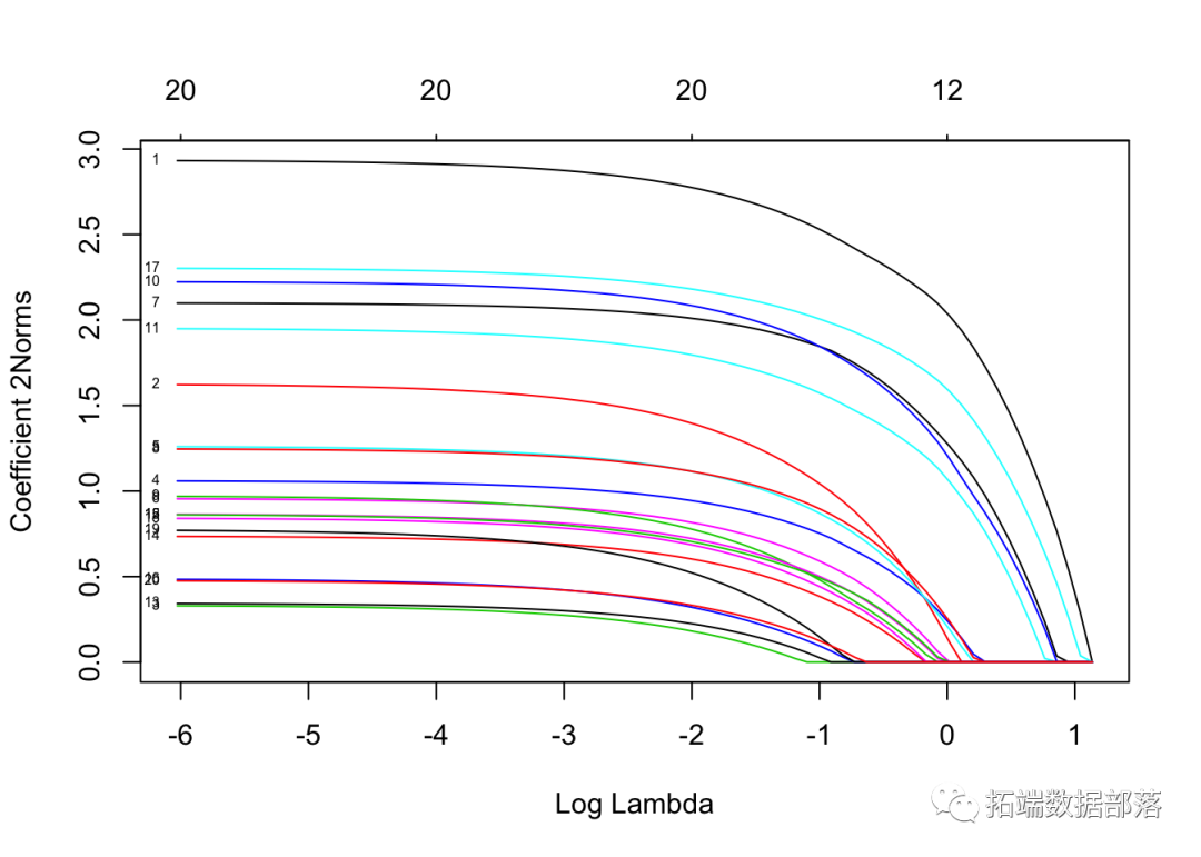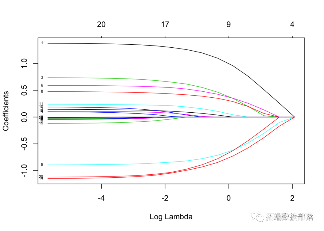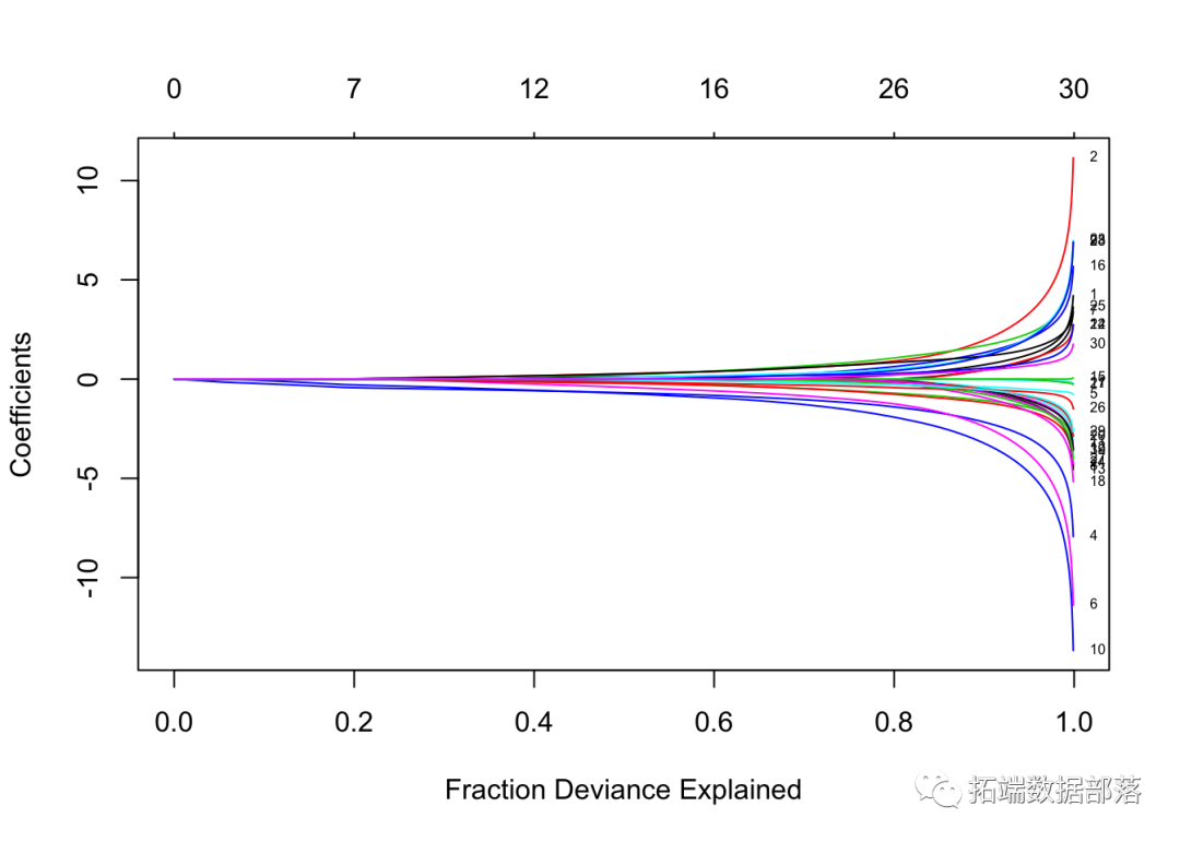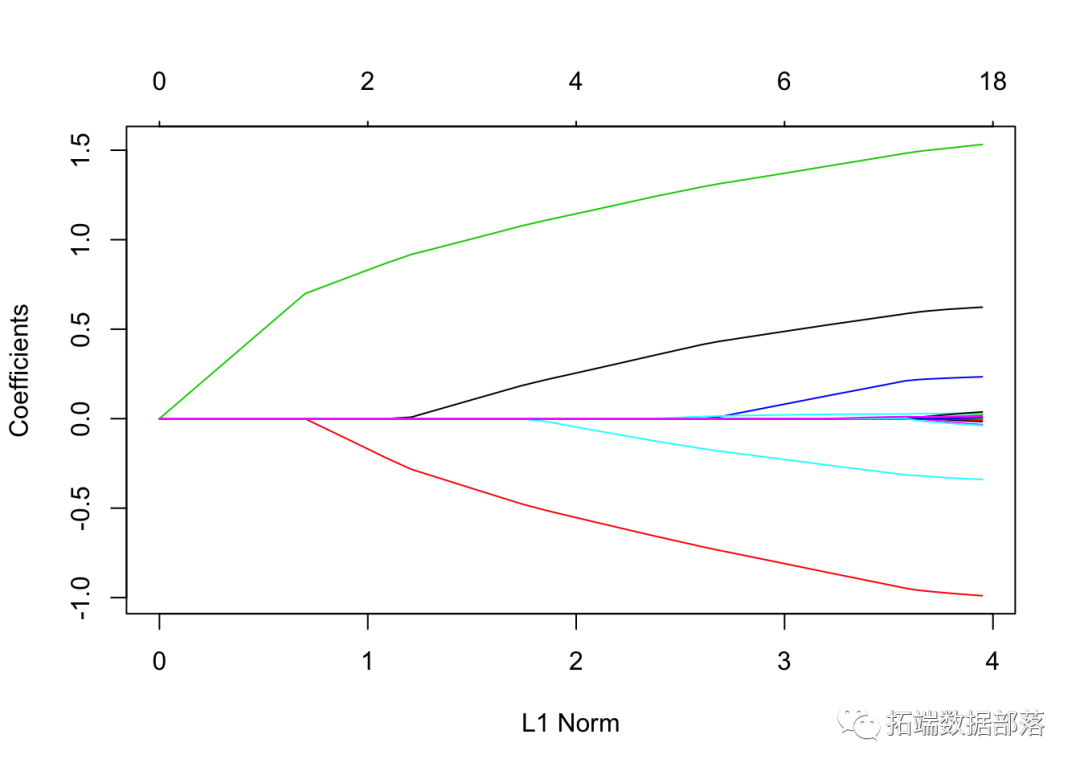 每条曲线对应一个变量。它显示了当λ变化时,其系数相对于整个系数向量的ℓ1范数的路径。上方的轴表示当前λ处非零系数的数量,这是套索的有效自由度(_df_)。用户可能还希望对曲线进行注释。这可以通过label = TRUE