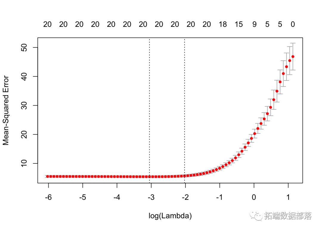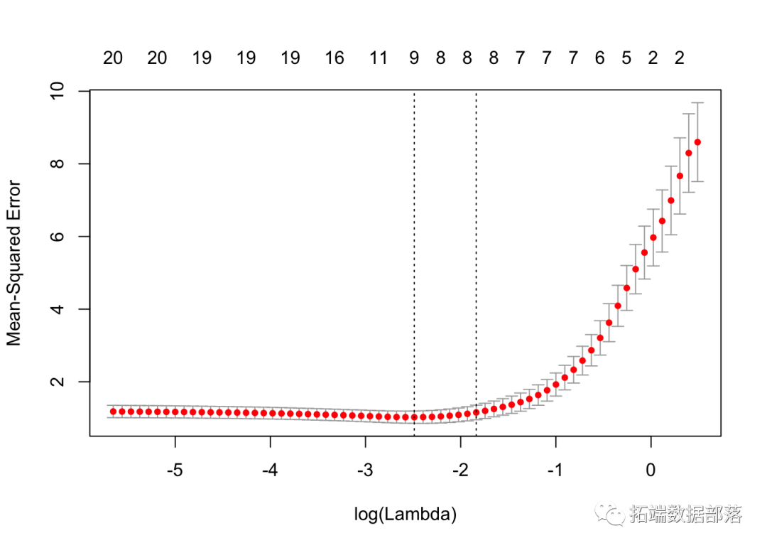 拟合后,我们可以查看最佳λ值和交叉验证的误差图,帮助评估我们的模型。