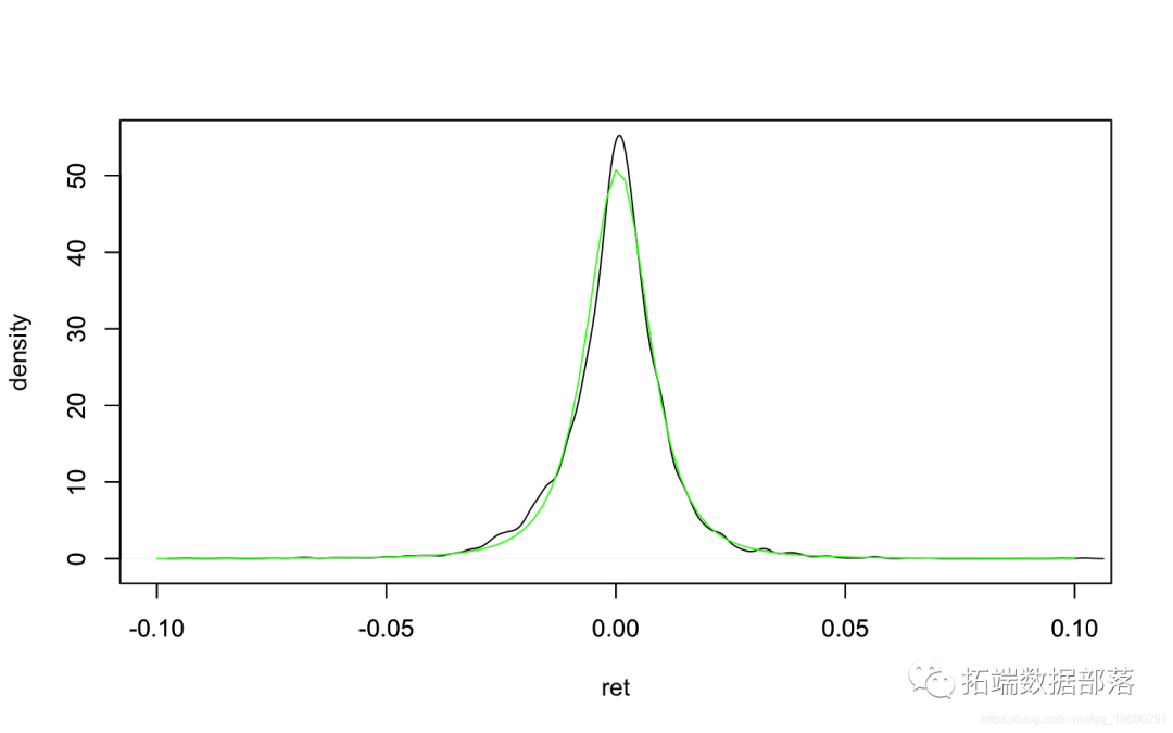 分布显示出尖峰和厚尾。可以通过t分布回归分布密度图来近似 。黑线是内核平滑的密度,绿线是t分布密度。
