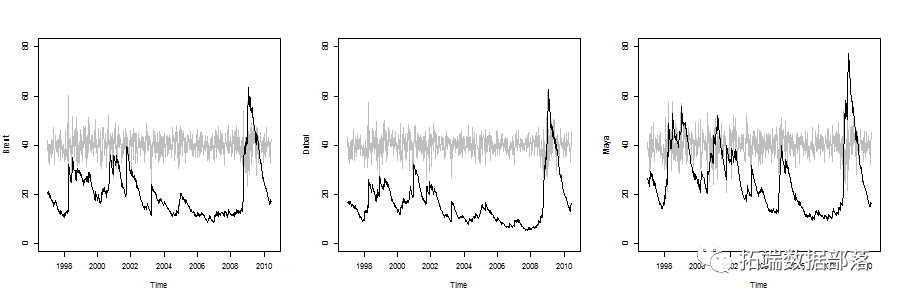 我用4189个观测值进行了回测(从2000-01-03到2016-10-06),使用前1000个观测值训练模型,然后每次向前滚动预测一个,然后每5个观测值重新估计模型一次 。下图显示 了样本外 预测和相应的实际波动率。