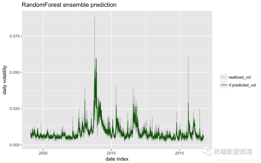 随机森林由500棵树组成,每棵树随机选择2个预测以拟合实际值。下图是拟合和实际波动率。