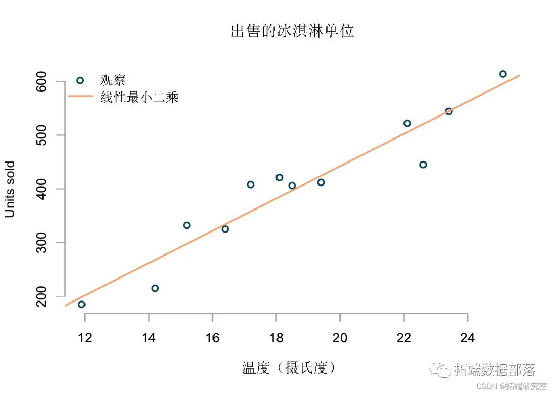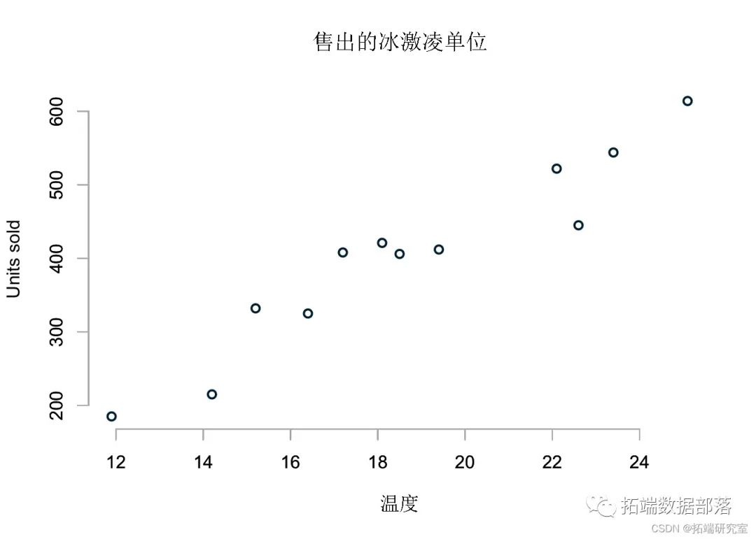 这是我将使用的示例数据集。它显示了在不同温度下销售的冰淇淋单位。正如预期的那样,更多的冰淇淋在更高的温度下出售。