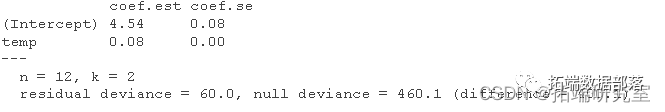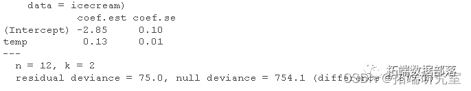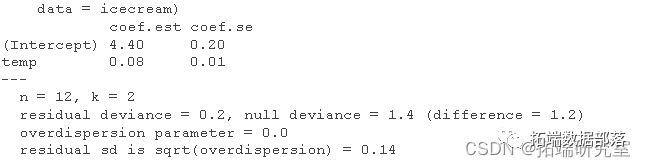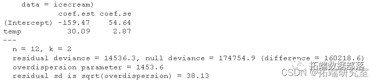 从系数中我可以看出,0ºC 时,我预计会卖出 exp(4.45)=94 冰淇淋,而温度每升高 1 度,预计销量会增加 exp(0.076)−1=7.9% .