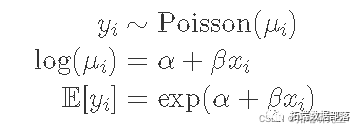 泊松分布只有一个参数,这里是 μi,这也是它的期望值。μi 的链接函数是对数,这意味着我必须将指数函数应用于线性模型才能恢复到原始比例。这是我的模型: