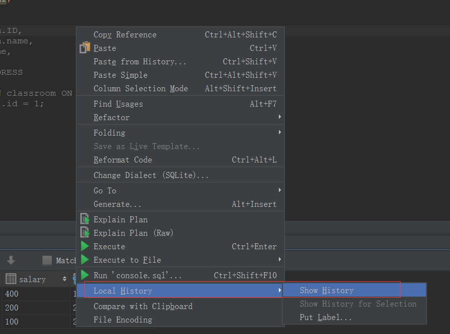 在文本编辑器中,邮件,local history,show history,可以查看使用过的sql历史