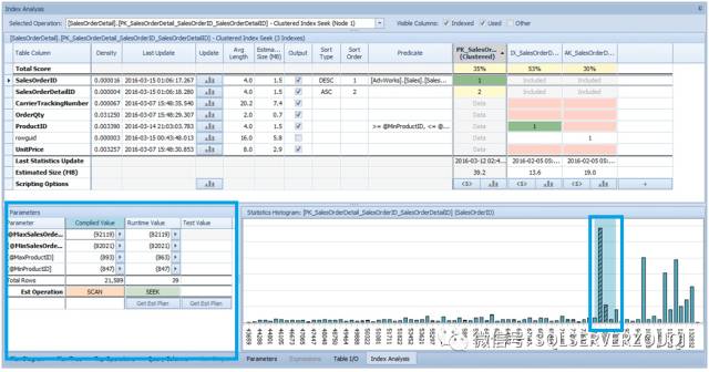 2. 直方图统计分析,提供新的查询参数以及对应统计信息并高亮显示,同时可以清晰地看到编译和运行时查询参数对性能的影响,快速发现可能导致系能的“参数嗅探”、排序问题,以及有可能使用合适过滤索引。
