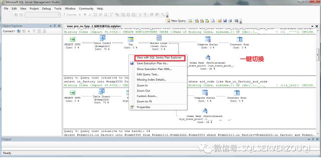 9. 在SSMS安装Plan Explorer插件后,在SSMS执行语句后显示的执行计划界面中,右键选择“View With SQL Sentry Plan Explorer”可以一键切换到 Plan Explorer,非常方便操作。