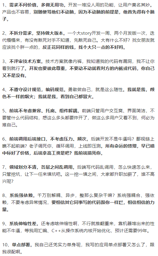 西游记告诉我们,凡是有后台的妖怪都被接走了,凡是没后台的都被一棒子打死了。在职场也是一样的道理,没有本事就不要作妖。话糙理不糙,相互借鉴学习。以上20条,有则改之,无则加冕,早日打造出“不宕机”的系统。