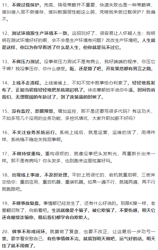 有人曾经说过:“打造一个偶尔宕机的系统并不难,难的是经常宕机,一辈子宕机,从来没有稳定过的系统,这才是最难的。”,这些血和泪的教训,总结下来总共20条,条条酸爽,大家看下有没有自己碰到过的。