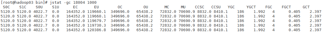 3、使用命令:jstat -gc 18004 1000 即可监控GC情况。其中:18004是JAVA进程的端口号, 1000表示1000毫秒,也就是每隔一秒展示GC监控数据;