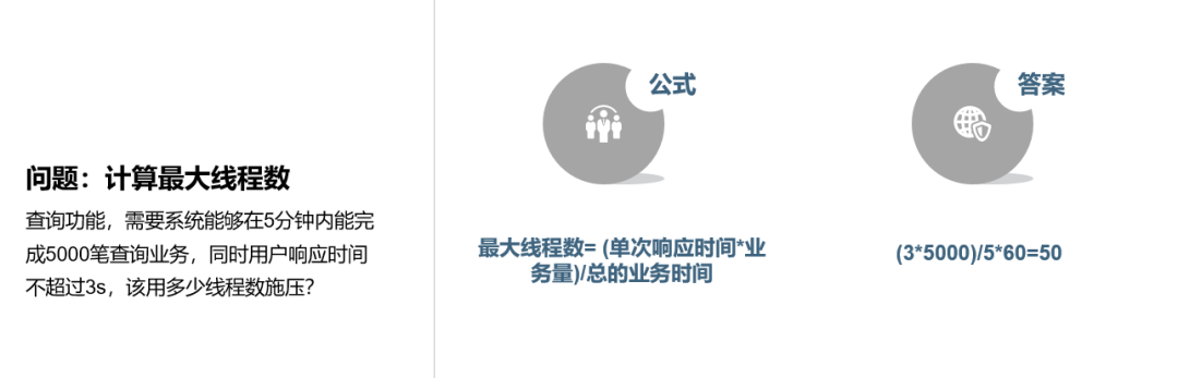 计算公式:最大线程数= (单次响应时间业务量)/总的业务时间