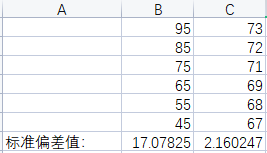 计算两组数据的标准偏差值,第二组2.16,第一组17.07,因此标准偏差的值越小,则说明各个样本的值越接近平均值: