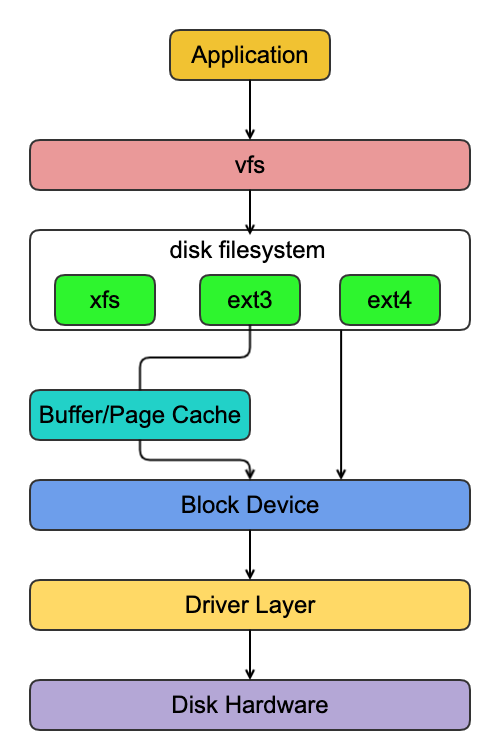 方式读写文件请求,首先经过内核的vfs,然后到实际的文件系统的对应的处理函数,接着请求进入那么设备映射,最后请求传递到了块设备的IO层,调度算法和IO优化也会在这里进行处理,块设备IO层处理完毕后就直接到了磁盘的驱动层,这一层就是调用IO命令来对磁盘进行读写。