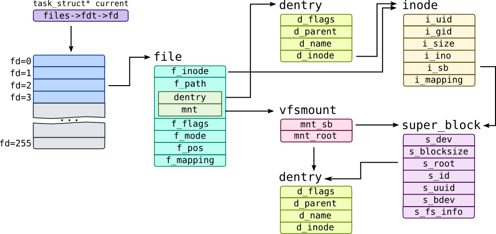 vfs层提供标准文件操作的函数接口,具体的文件操作函数是由实际问价系统提供。针对应用程序访问文件系统,比如你执行一个