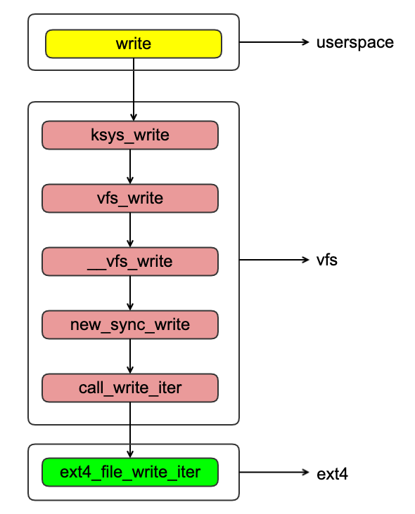 // call_write_iter是直接调用f_op->write_iter函数,这里对应的是 ext4_file_write_iter,到了这里虚拟文件系统层基本已经结束,进入实际文件系统的调用过程。