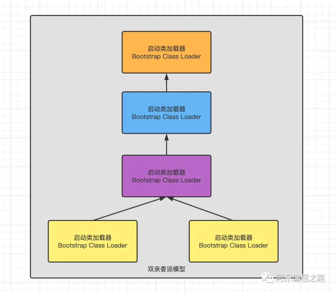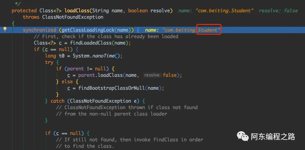 // ClassLoader$loadClass源码protected Class<?> loadClass(String name, boolean resolve)throws ClassNotFoundException{// 加锁保证并发时的类加载synchronized (getClassLoadingLock(name)) {// 检查类是否被加载Class<?> c = findLoadedClass(name);// 如果类没有被加载if (c == null) {long t0 = System.nanoTime();try {// 如果父加载器不为空就委托给父类加载器if (parent != null) {c = parent.loadClass(name, false);} else {// 为空代表顶层是启动类加载器或自定义类加载器没设置父类加载器// 交给启动类加载器加载c = findBootstrapClassOrNull(name);}} catch (ClassNotFoundException e) {// 父类加载器加载失败后会抛出ClassNotFoundException异常// 子类加载器catch异常后,调用自己的findClass()方法进行加载}if (c == null) {// If still not found, then invoke findClass in order// to find the class.long t1 = System.nanoTime();// 根据名称或位置加载.class字节码c = findClass(name);// this is the defining class loader; record the statssun.misc.PerfCounter.getParentDelegationTime().addTime(t1 - t0);sun.misc.PerfCounter.getFindClassTime().addElapsedTimeFrom(t1);sun.misc.PerfCounter.getFindClasses().increment();}}if (resolve) {resolveClass(c);}return c;}}