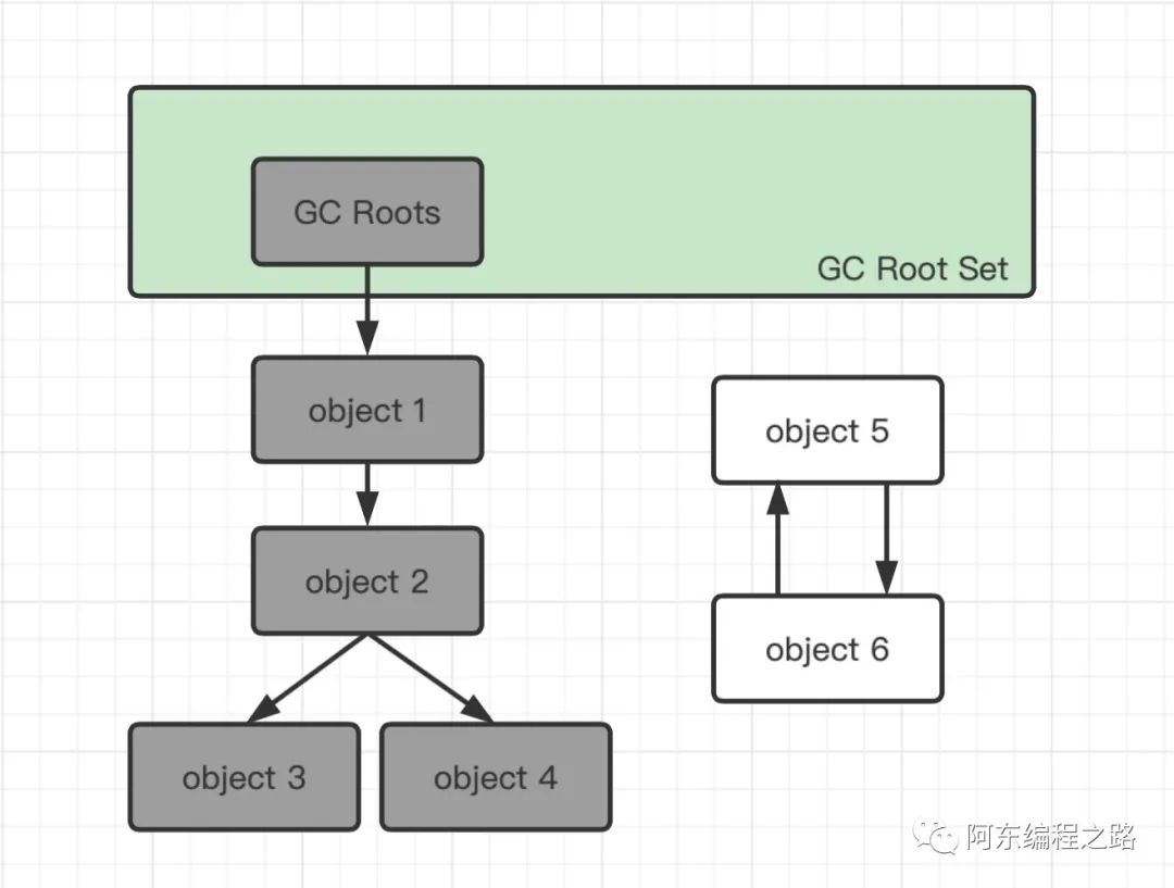 上图中灰色代表对象存活,白色代表可以回收的对象;可以看到,如果对象到根对象上没有引用链相连,不管这么循环引用都算作可回收对象,所以可达性分析算法就不会有循环引用导致的内存泄漏问题。