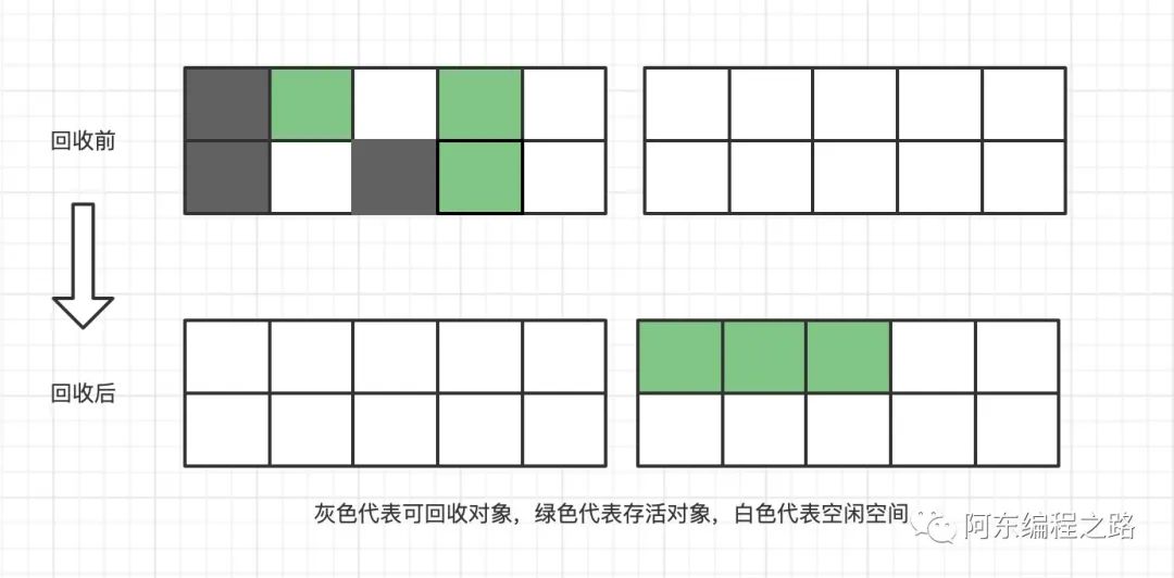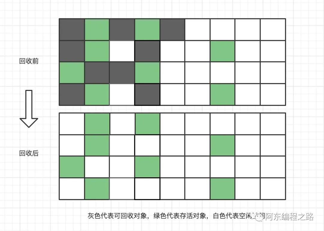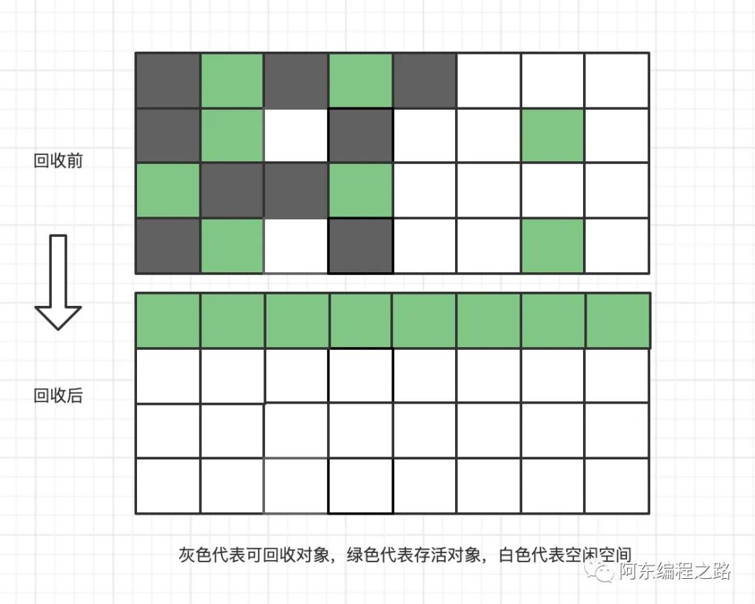 标记-整理算法它来了!标记 - 整理算法的思想是:和标记 - 清除算法一样先标记对象,然后将存活的对象移动到内存空间的一端,最后一次性清理掉边界以外的内存。标记-整理算法和标记-清除算法的唯一区别就是标记-整理会在标记后移动对象。而这个移动对象的操作也是一种重量级操作。