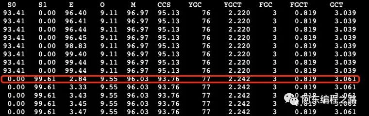 我们看到红线处因为Eden区满了发生了一次Young GC,E 和 S0区域的对象复制到了S1,部分对象由新生代移动到了老年代O区,YGC次数由76变为77。