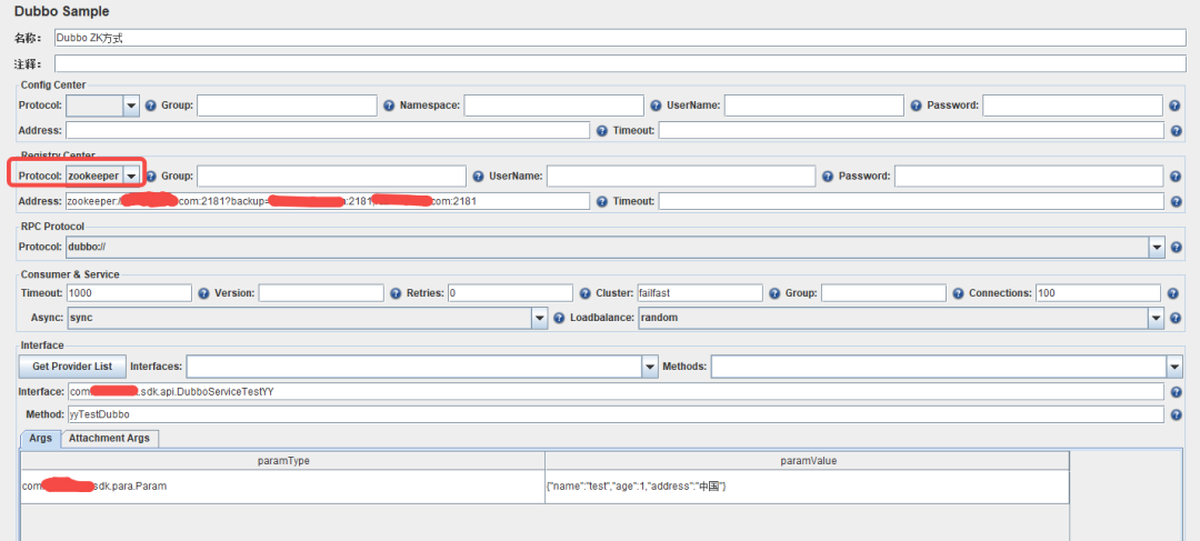 由于是用ZK的方式,所以Protocol选zookeeper。Address填写直连服务器的信息:zookeeper://devzk1.xx.com:2181?backup=devzk2.xx.com:2181,devzk3.xx.com:2181