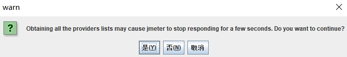 意思是:获取所有提供者的服务列表,可能会导致 JMeter 停止响应几秒钟。你要继续吗?