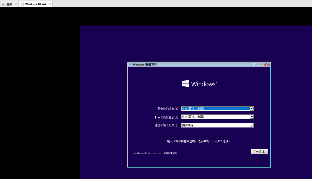 点击“确定”按钮保存配置后,再运行虚拟机,则会发现OK了,进入了win10的安装页面: