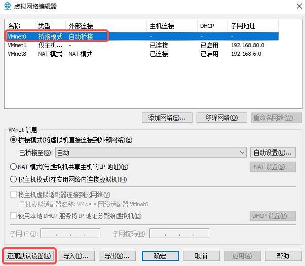 会发现多了一个“桥接模式”,选中它,点击按钮“还原默认配置”: