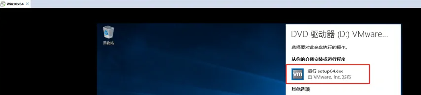 然后win10系统右下角就会提示DVD驱动器:VMware Tools, 点击它,运行setup64.exe: