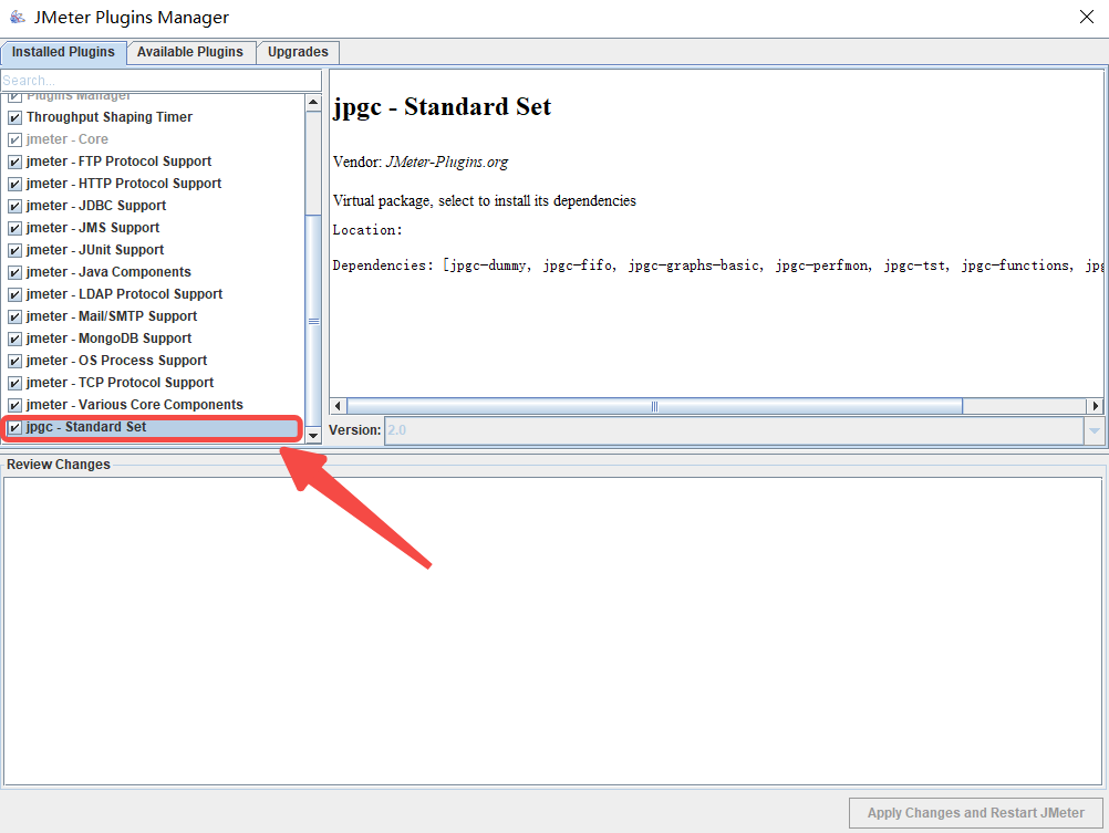 Upgrades(可更新的插件):即可以更新到最新版本的一些插件,可以通过点击截图右下角的Apply Changes and Restart Jmeter按钮来下载更新;