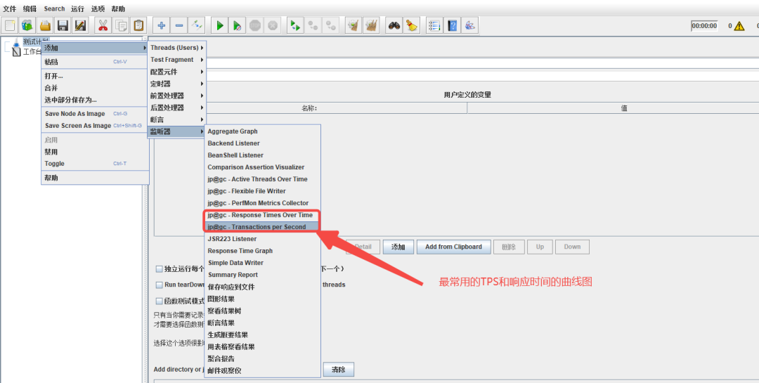 添加监听器这里可以看到多了很多jp@gc选项,其中Reponse Times Over Time为响应时间监听器,Transactions per Second为tps监听器: