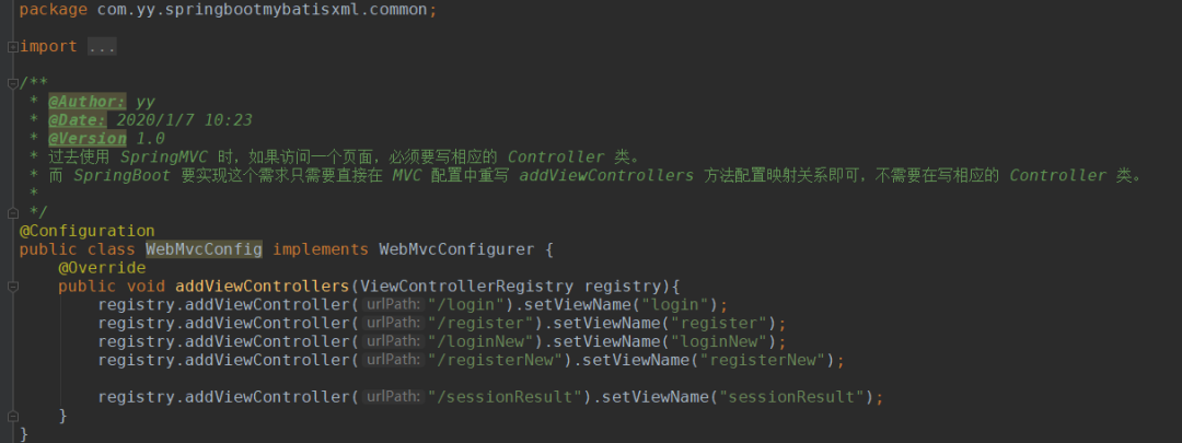 WebMvc配置类,用于重写addViewControllers方法配置映射关系,实现页面路由: