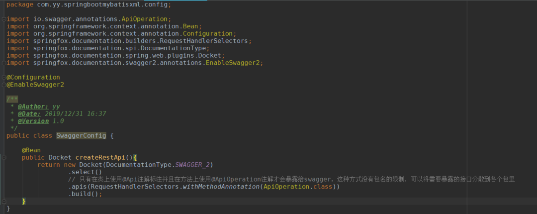 ├──SwaggerConfig Swagger配置类,配置只有在方法上使用@ApiOperation注解才会暴露给swagger