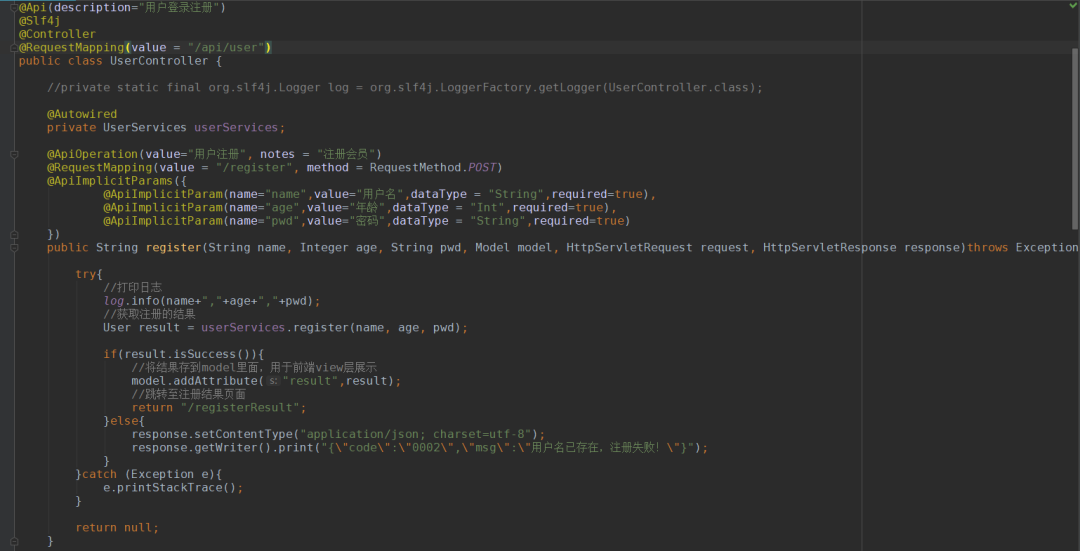 controller层,定义前端请求与后端接口的映射关系, 主要是两个接口,注册和登录: