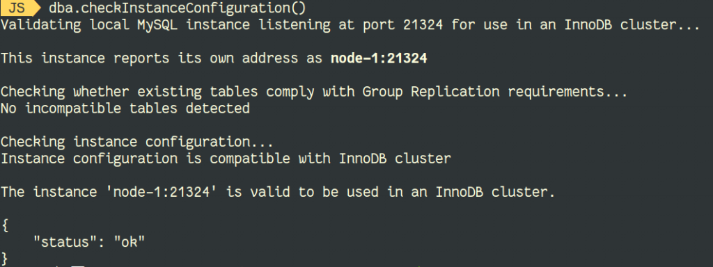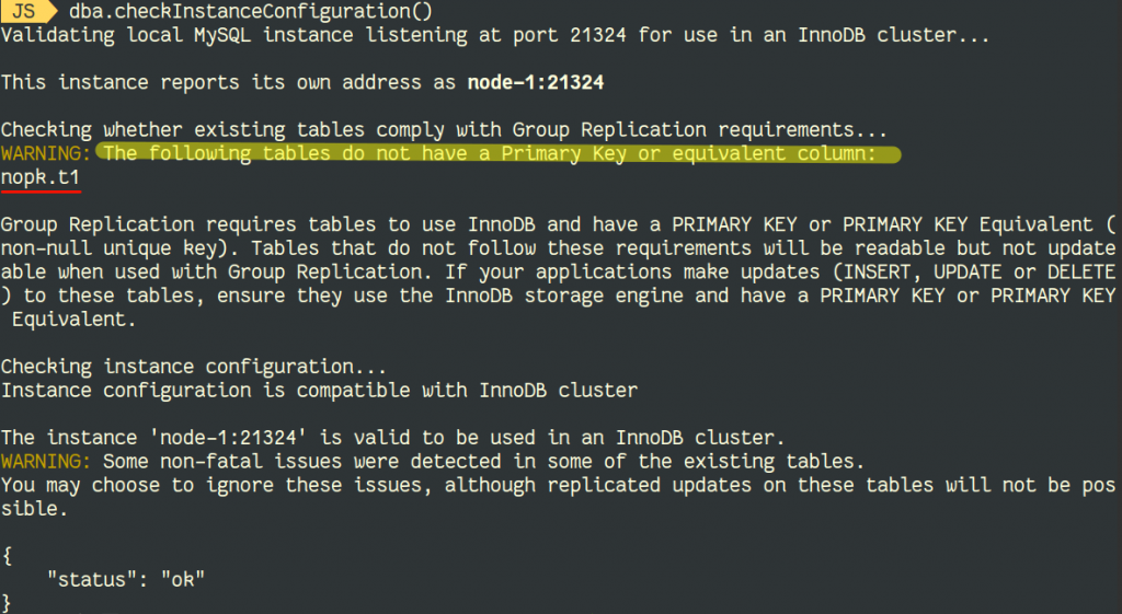 我们使用上例中重构表,不加主键,检查该实例能否作为InnoDB Cluster: