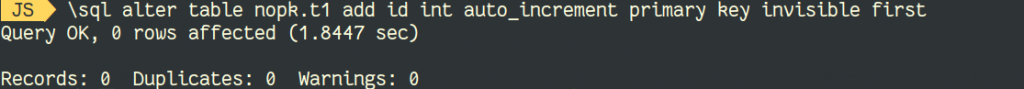 mysql > alter table t1 modify id int auto_increment invisible;mysql > insert into t1 values ('python',20);Query OK, 1 row affected (0.0887 sec)