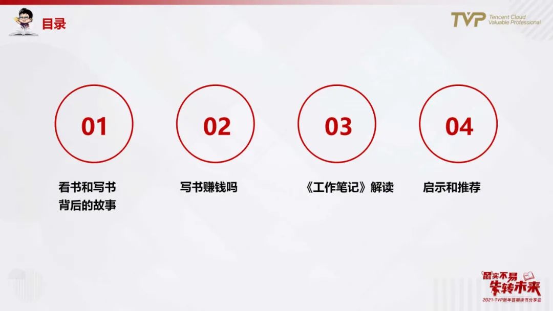 我的分享分为如下的4个部分,因为分享时间在15分钟左右,所以总体的内容就直白简单一些。我的解读会尽可能聚焦在一本书的过程上,希望通过短短的分享能让大家更聚焦一些,当然在后面我也会推荐一些自己感兴趣的书。