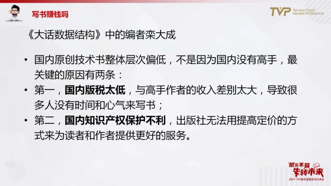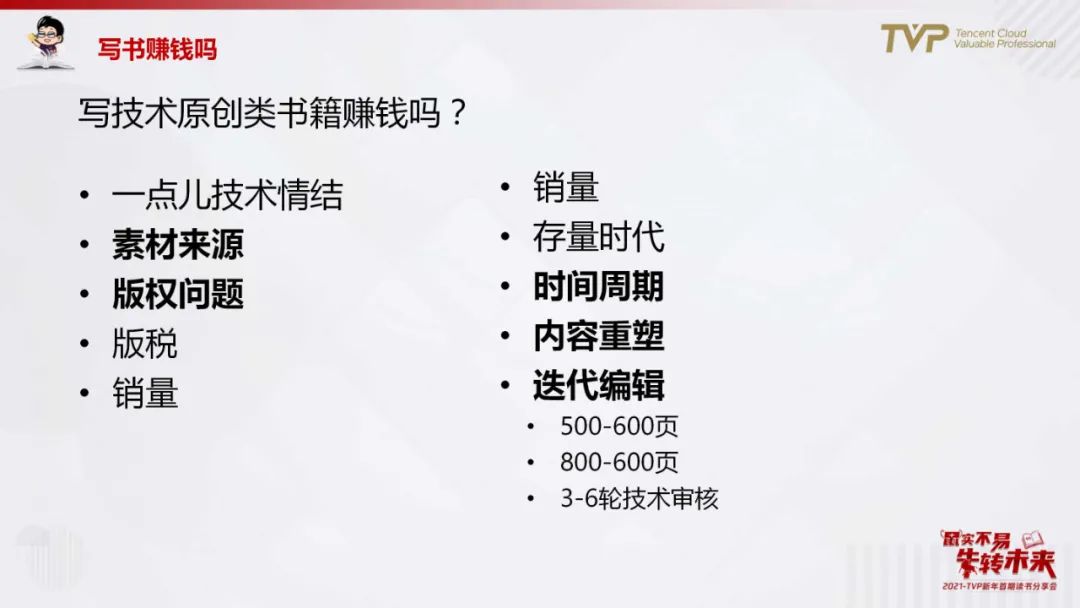 此外从收益角度,主要有版权问题,也就是你写成的书如果马上被盗版复印,其实内心还是很失落的,销量问题,这些事作者无法控制的事情,可以看到的是网购图书早已成为主流的模式,而我们已经步入了存量时代,在内容的重塑方面,做技术的人会有一种技术洁癖,那就是看自己1年前些的代码或者文章,简直不堪入目,而改进的策略很可能需要重新写,这个代价很高。