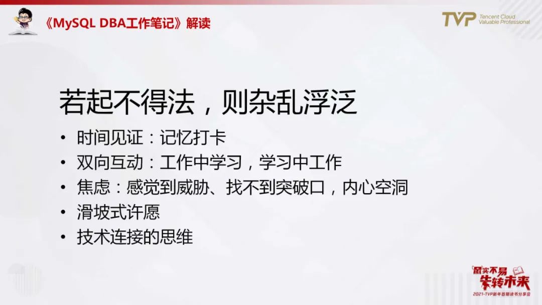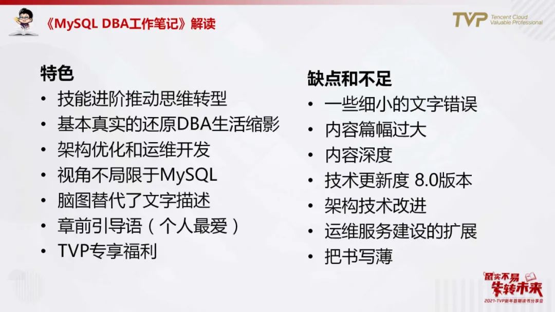 我不太喜欢那种说自己的书怎么好,我提几个特色吧。首先是这本书的最大感受,这是编辑老师问我的一个问题,我当时的一句话总结就是“技能进阶推动思维转型”,这也是我自己的目前的技术理想。整个笔记算是基本真实还原了DBA生活的缩影,另外我想表达的是需要换个视角,不要单纯从MySQL的角度去看待问题,应该还有很合适的方案,最后是我的个人最爱,那就是章前引导语,我摘录了一些个人喜欢的语录和座右铭,放在每章的开头。
