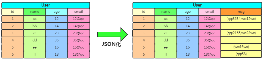 但是你要知道不是所有用户都要微信号的,微信号这一列是设置默认值还是采取其他的做法就得权衡一下了。如果需扩展很多列出来,但不是所有的用户都有这些属性,那么拓展起来就更加复杂了。这时可以用下JSON格式的字符串,将若干可选择填写信息汇总,而且属性字段可以动态拓展,于是有了下边做法: