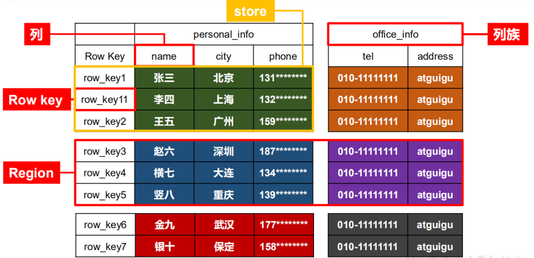 HBase 中的每个列都由 Column Family(列族) 和 Column Qualifier(列限定符)进行限定,例如 info:name、info:age。建表时只需指明列族,而列限定符无需预先定义。