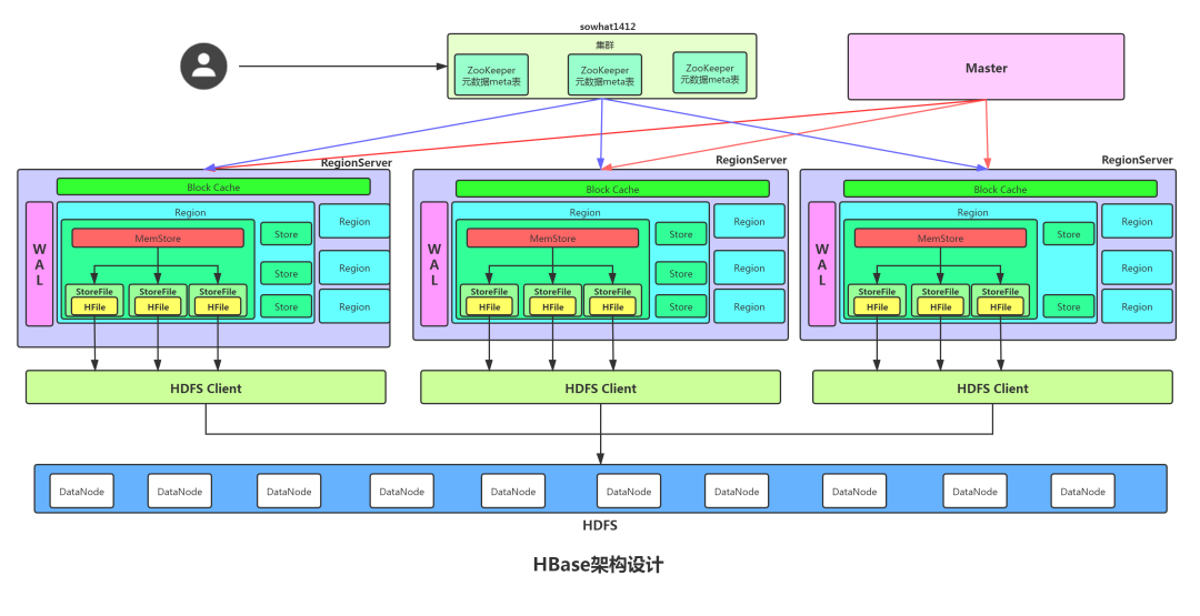 在HBase集群中如果我们做 DML 操作是不需要关心 HMaster 的,只需要从 ZooKeeper 中获得hbase:meta 数据地址,然后从RegionServer中增删查数据即可。