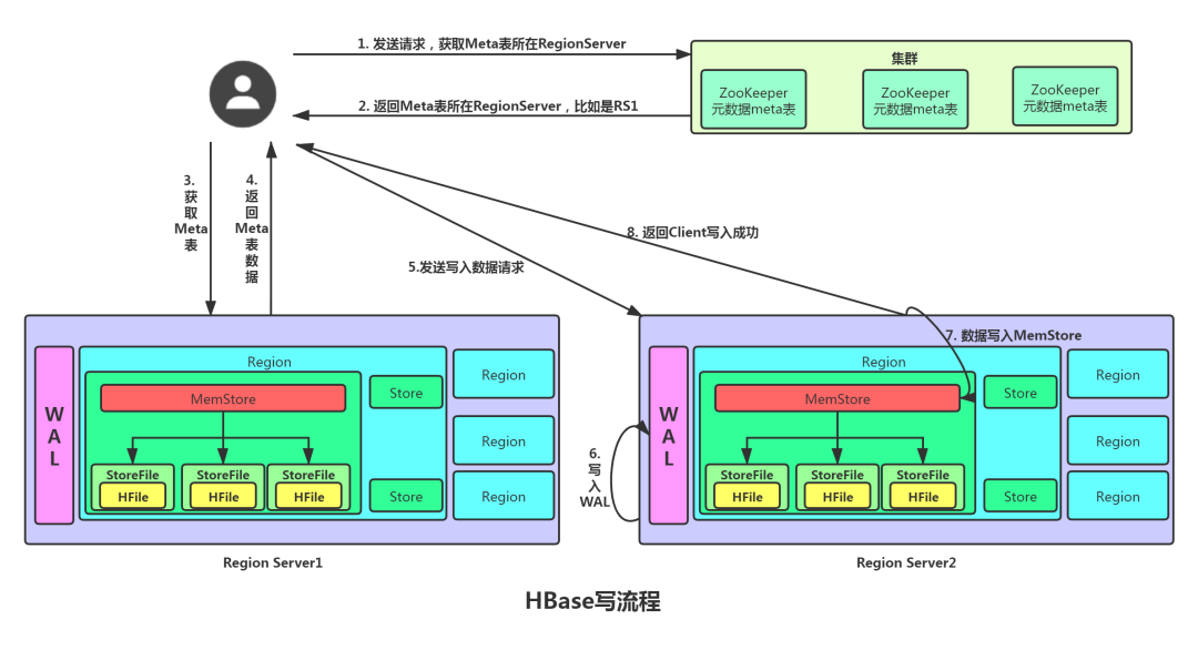 Client 先访问 ZooKeeper,获取 hbase:meta 表位于哪个 Region Server。 访问对应的 Region Server,获取 hbase:meta 表,根据读请求的 namespace:table/rowkey, 查询出目标数据位于哪个 Region Server 中的哪个 Region 中。并将该 table 的 region 信息以 及 meta 表的位置信息缓存在客户端的 meta cache,方便下次访问。 与目标 Region Server 进行通讯。 分别在 Block Cache(读缓存),MemStore 和 Store File(HFile)中查询目标数据,并将 查到的所有数据进行合并。此处所有数据是指同一条数据的不同版本(time stamp)或者不同的类型(Put/Delete)。 将从文件HFile中查询到的数据块(Block,HFile 数据存储单元,默认大小为 64KB)缓存到 Block Cache。 将合并后的最终结果,然后返回时间最新的数据返回给客户端。