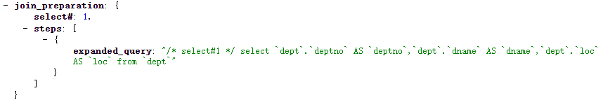 第一部分是完成SQL的准备工作。在这个阶段,SQL语句会被格式化输出,通配符*会被具体字段代替,但不会进行等价改写动作。如上图中传入的SQL语句是”select * from dept”的结果。在完成了语句的补充、格式化后,准备阶段结束并进入下一阶段。