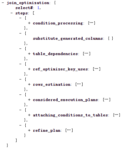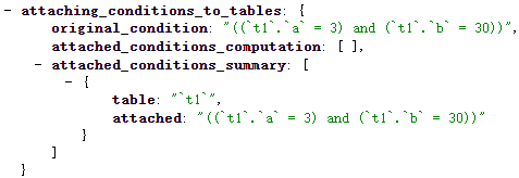 这一部分是完成对条件语句的优化,包括对WHERE子句或HAVING子句的优化。在后面的”condition”部分就标识出是对哪类子句的优化,如下图就是对WHERE子句的优化。