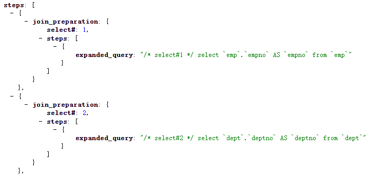 第二部分,是完成SQL语句的逻辑与物理优化的过程,这其中的优化步骤比较多。在展开具体内容之前,先解释下”select #”的问题。在输出中经常会看到有”select#:N”的字样,它表示当前跟踪的结构体是属于第几个SELECT。如果语句中使用多个SELECT语句拼接(如UNION)或者有嵌套子查询中有SELECT,会产生多个序号。例如下面例子就是使用UNION的结果。